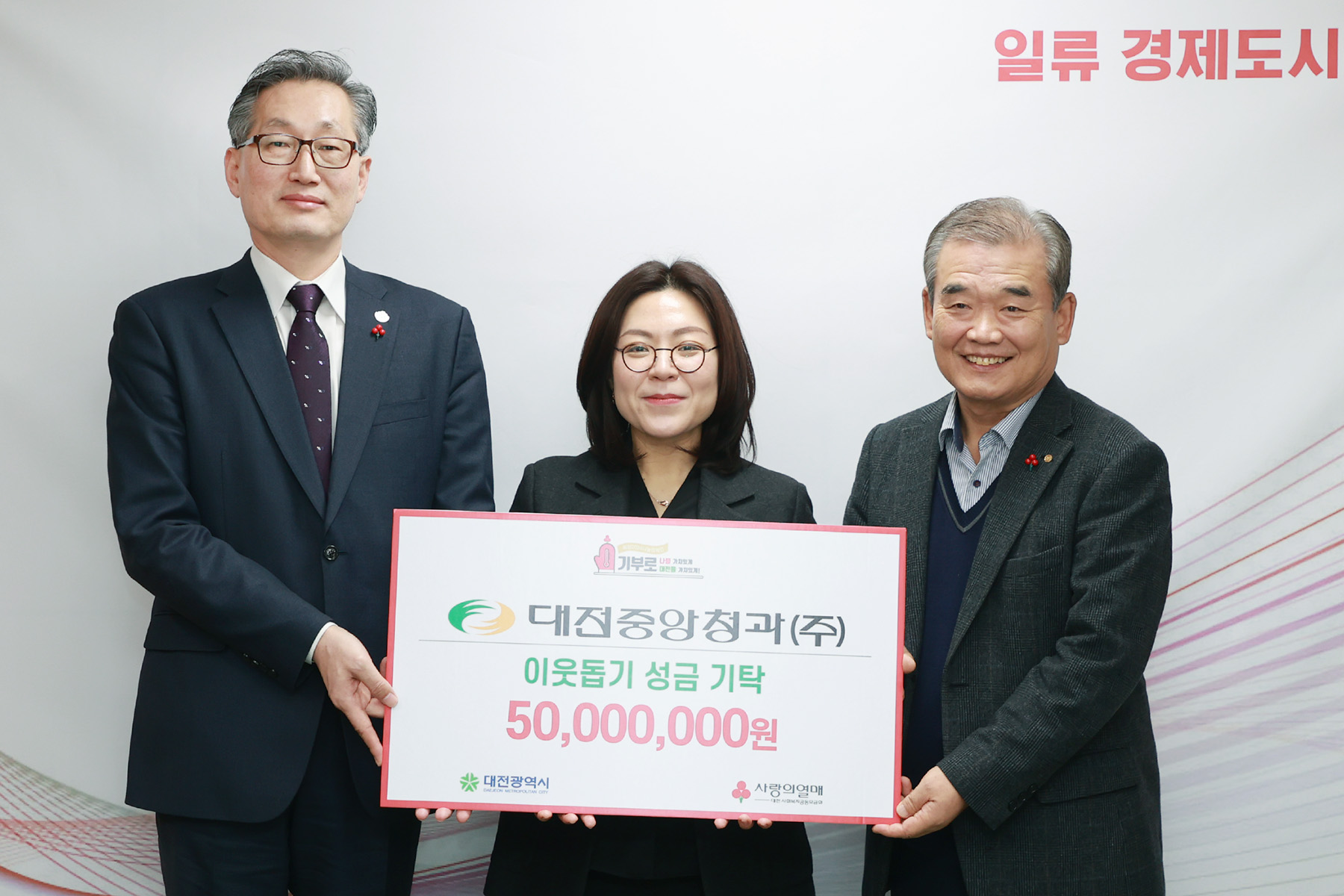 대전중앙청과(주) 송미나 대표이사는 “온정을 담은 이번 성금이 어려운 이웃에게 따뜻한 사랑과 희망으로 전해지길 바란다”라며 “앞으로도 우리 임직원 모두는 신뢰를 바탕으로 안전한 농산물 공급에 힘쓰고 지역 사랑 실천에 앞장서겠다”라고 말했다.