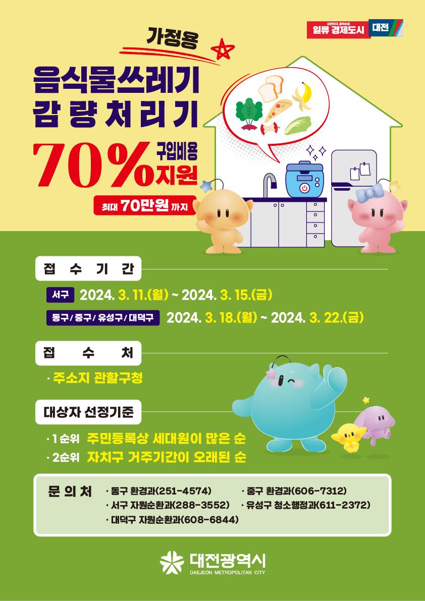 대전시는 가정에서 발생하는 음식물쓰레기를 줄이고, 편리하고 위생적인 음식물쓰레기 배출 환경을 조성하기 위해 26일부터 가정용 음식물쓰레기 감량처리기 지원사업을 추진한다.