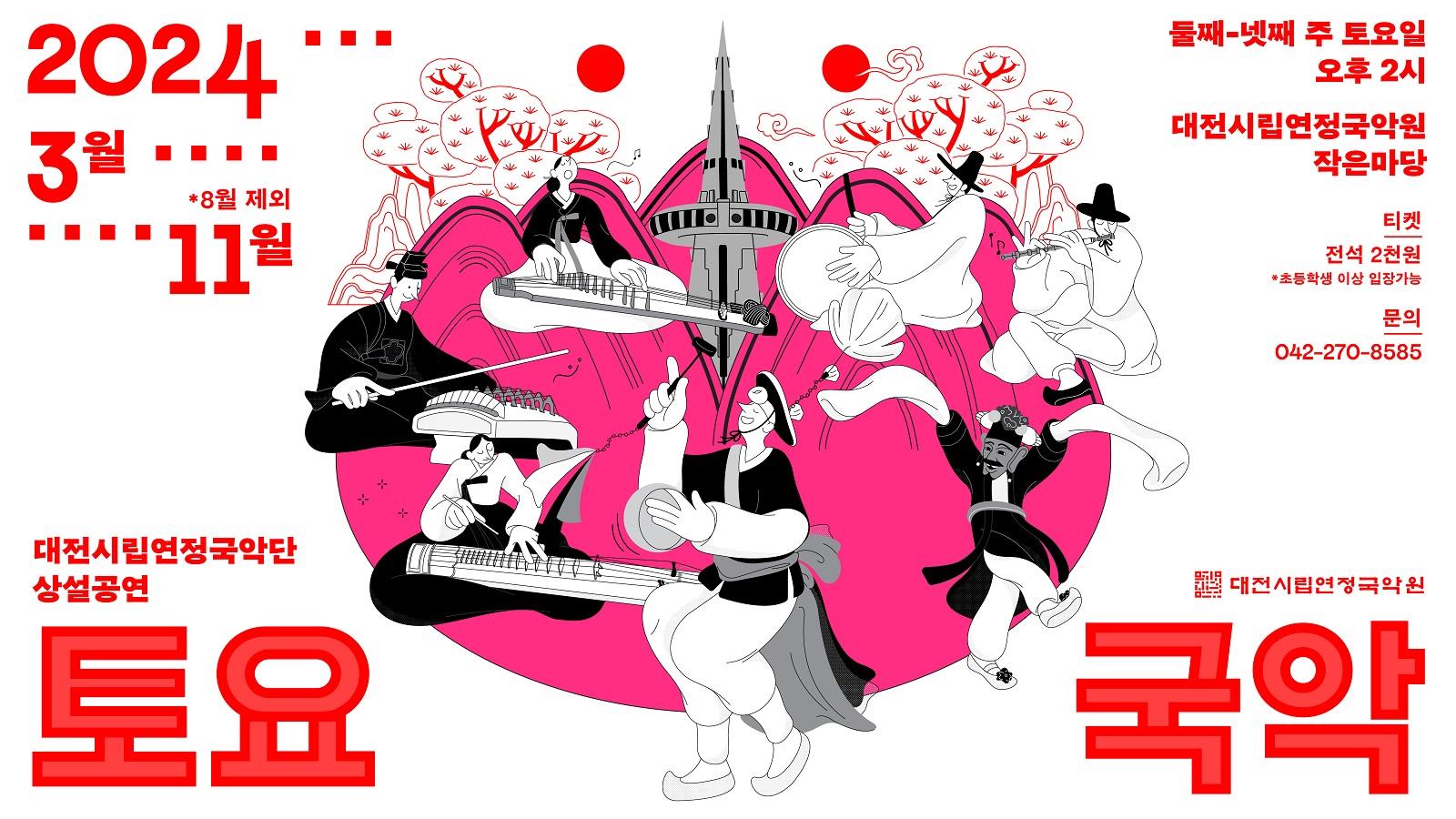 대전시립연정국악단의 시그니처 공연 [토요국악]이 3월부터 11월까지(8월 제외) 둘째, 넷째 주 토요일 오후 2시 국악원 작은마당에서 16회 상설공연으로 펼쳐진다.