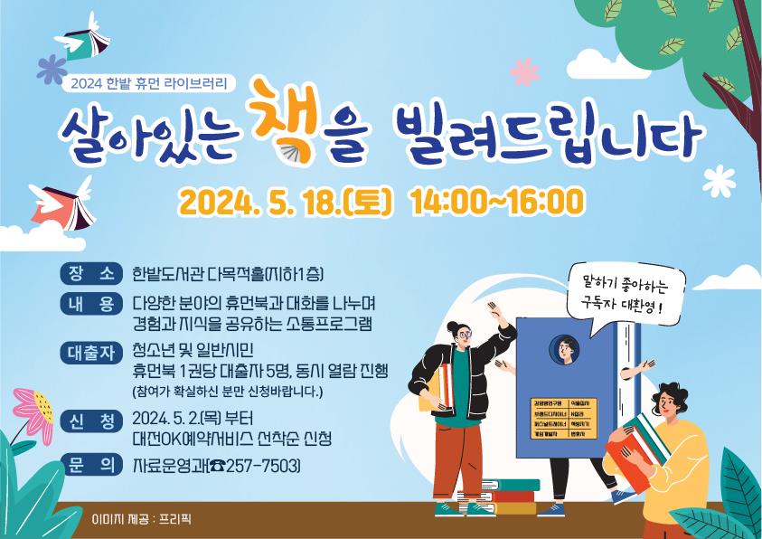 자세한 내용은 한밭도서관 홈페이지 공지사항에서 「2024 한밭 휴먼 라이브러리」를 참조하면 된다.