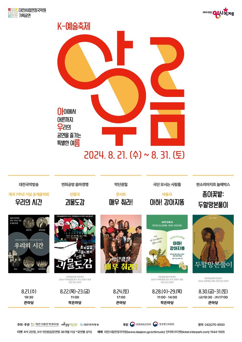 대전시립연정국악원(이하 국악원)이 대한민국 유일의 전통예술 기반 여름 공연예술축제인‘K-예술축제 아·우·름’(아이에서 어른까지 우리의 공연을 즐기는 특별한 여름)을 8월 21일부터 31일까지 11일간 대전시립연정국악원 큰마당과 작은마당에서 개최한다.