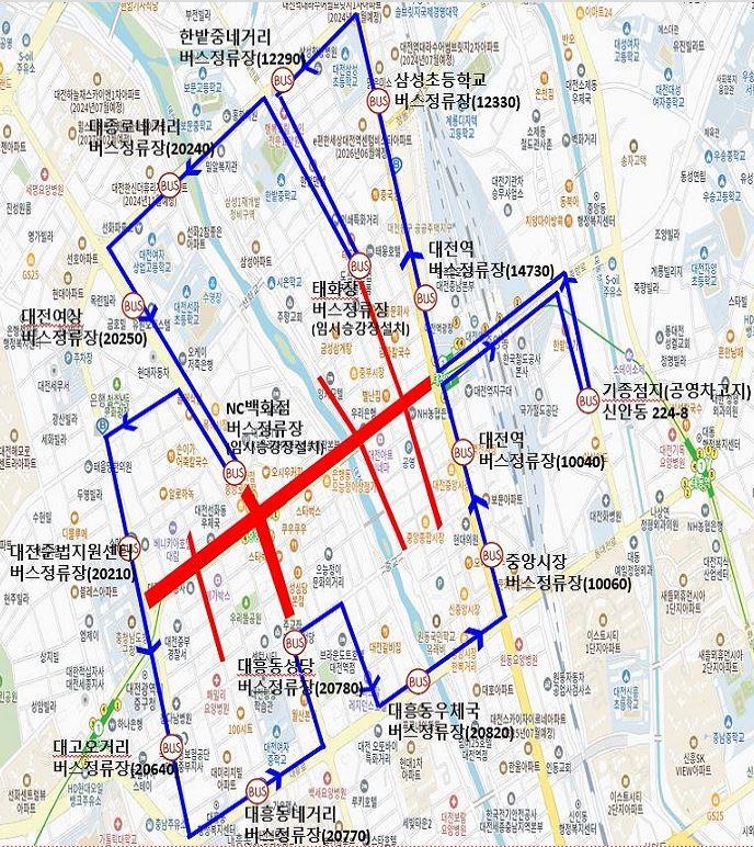 노선은 대전역-역전시장-중앙시장-대흥동우체국-대흥동성당-대흥동네거리-대고오거리-대전준법지원센터-NC백화점(5분~10분정차)-대전여상-대종로네거리-태화장-한밭중네거리-삼성초 구간을 양방향 순환한다.