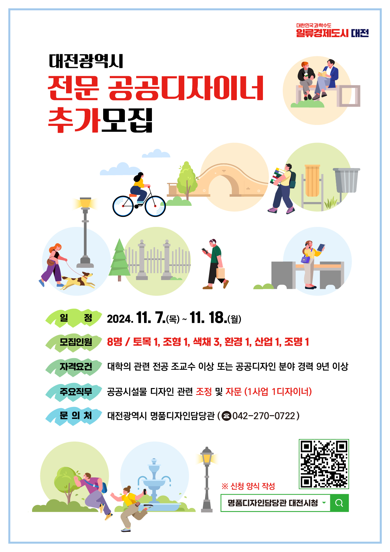 대전시는 공공시설물 사업의 기획부터 준공까지 디자인 분야의 조정·자문 역할을 수행할 ‘대전시 전문 공공디자이너’를 11월 18일까지 추가 모집한다.