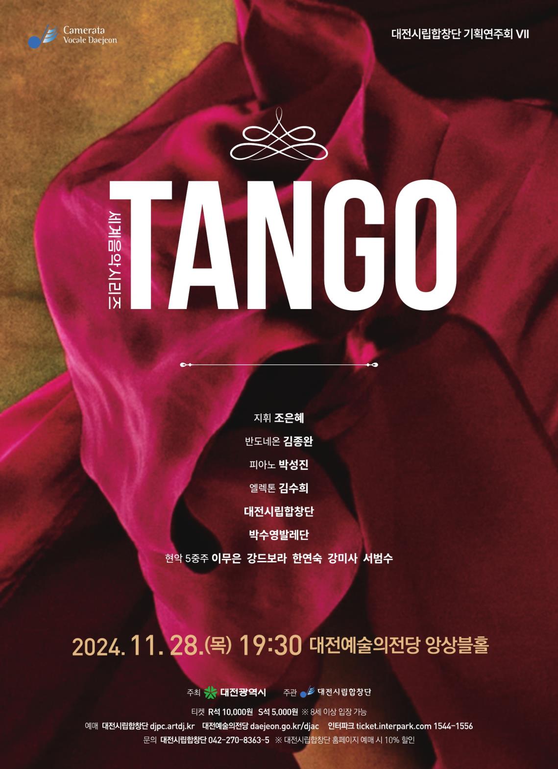 이번 연주회는 대전시립합창단 전임지휘자 조은혜의 지휘 아래 반도네오니스트 김종완의 이국적인 멜로디와 현악 5중주의 풍성한 선율, 공연 완성도를 높여줄 발레까지 선보이며 관객들에게 정열의 탱고 무대를 선사할 것이다.