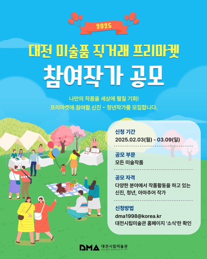 대전시립미술관(관장 윤의향)은 다음 달 9일까지 지역 예술인의 역량 강화와 전시 기회 확대를 위해‘2025 대전 미술품 직거래 프리마켓’에 참여할 작가 200명을 모집한다.