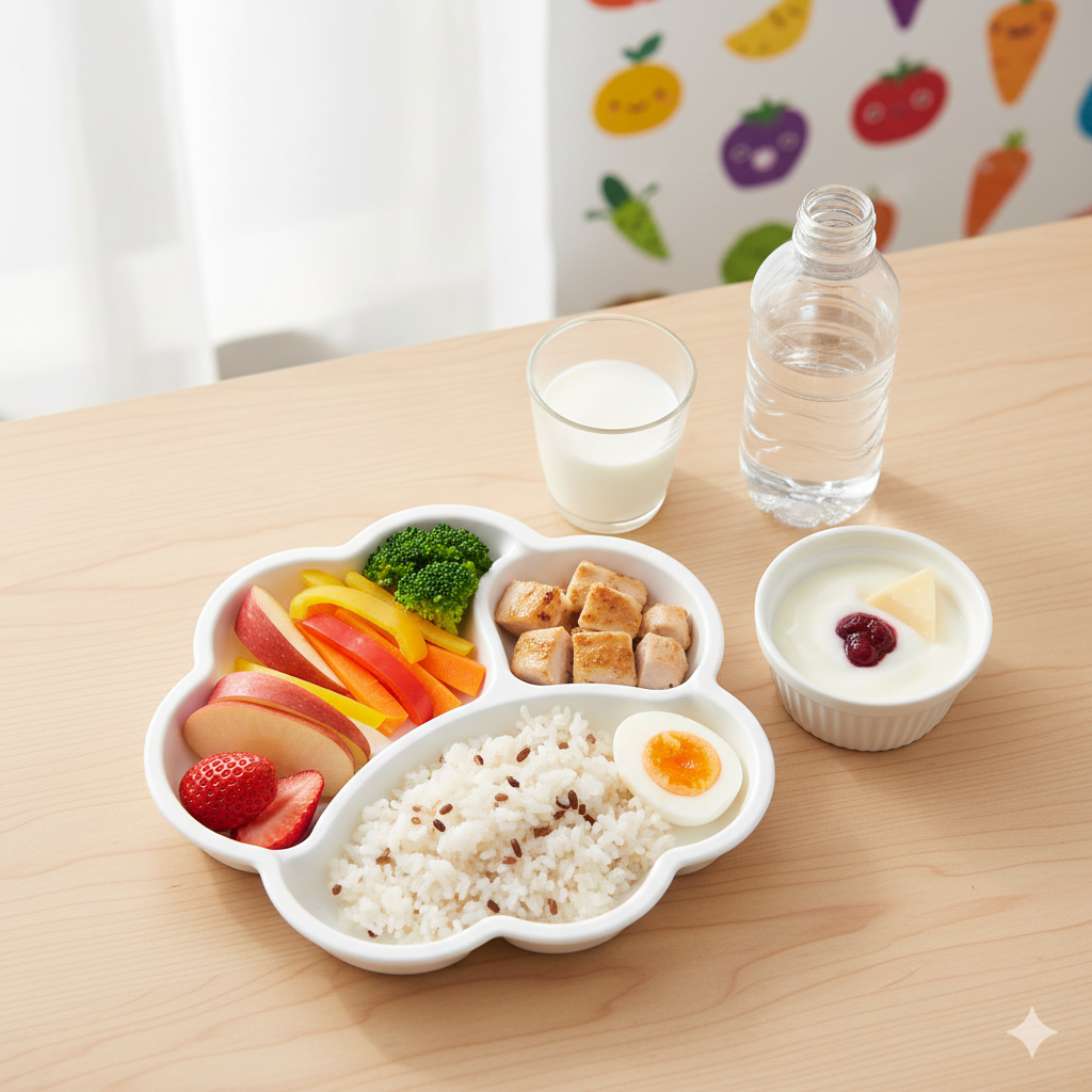 1. 빨강, 주황, 노랑 – 과일과 채소 친구들 (비타민과 미네랄) 사과, 딸기, 토마토처럼 빨간색 과일과 당근, 오렌지처럼 주황색 과일과 채소는 우리 몸에 비타민을 많이 가져다줘요. 비타민은 감기에 걸리지 않게 도와주고, 피부를 깨끗하게 해준답니다. 시금치, 브로콜리 같은 초록색 채소도 몸속 나쁜 독소를 없애주고 뼈를 튼튼하게 해요. 매일 식판에 알록달록한 과일과 채소를 꼭 올려주세요!