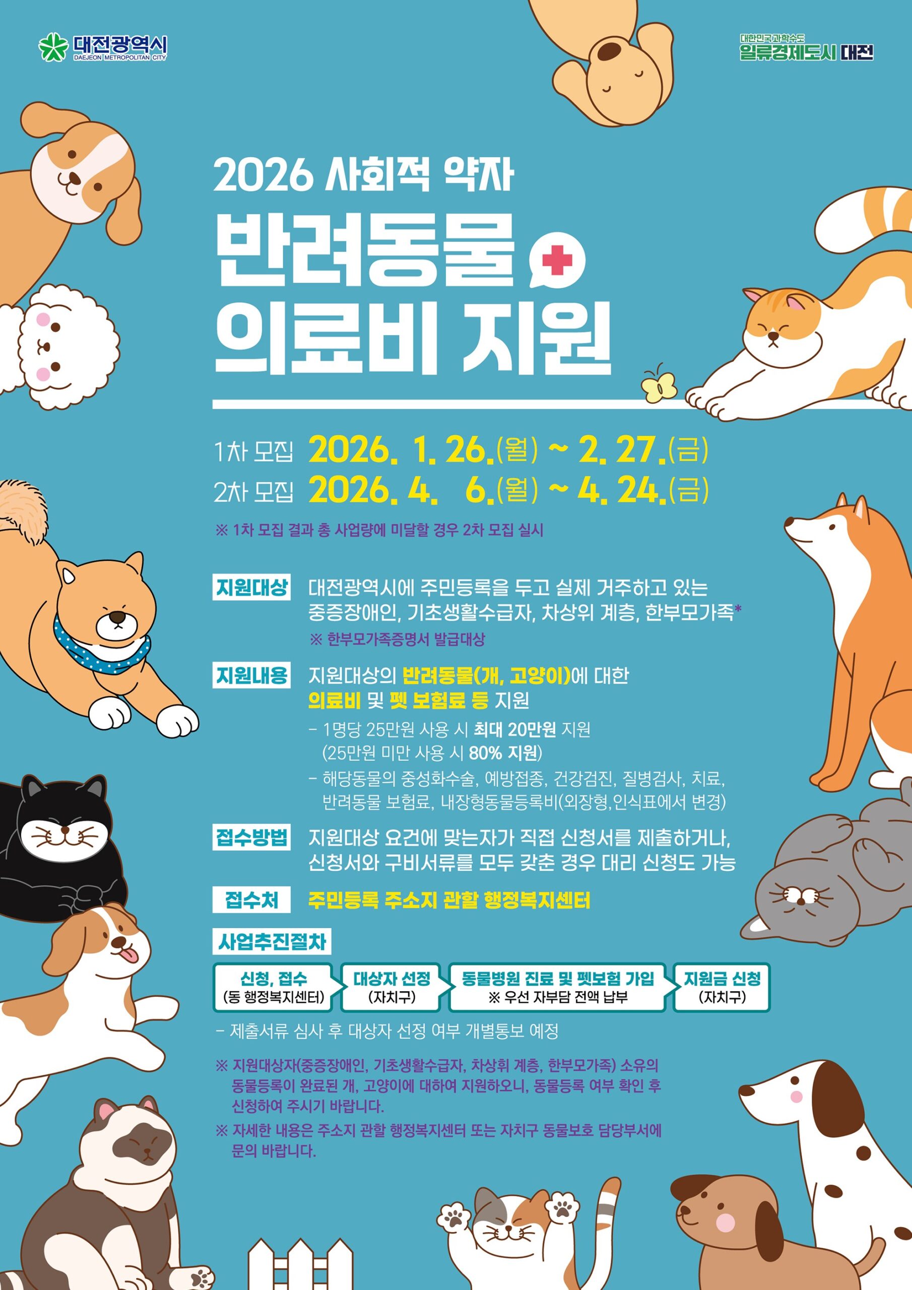 대전시는 사회적 약자의 반려동물(동물등록을 완료한 개, 고양이) 의료비 부담을 덜고, 반려동물의 적정 보호를 돕기 위해 「2026년 사회적 약자 반려동물 의료비 지원사업」 대상자를 모집한다.